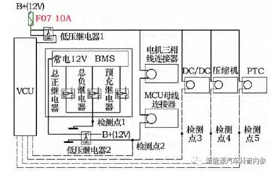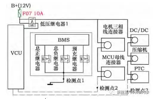 检测点2,既是电机和电机操控器高压互锁的监测点,也连接着低压继电器2的线圈一端。当电机和电机操控器的HVIL连接正常时,检测点2的电压是12V,VCU指令继电器2吸合,经过继电器2给BMS供应12V电源;当连接器没有无缺连接,VCU要求继电器2断开,则检测点2电压为0,BMS电源为0,不能作业;这个回路的总体主意是由电机的连接状况去操控BMS作业与否。